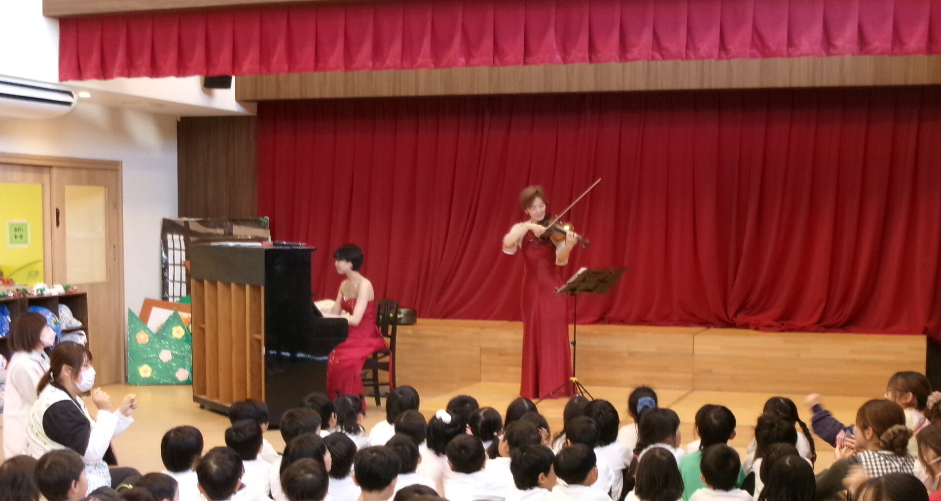 ピアノは日頃から見ていて見慣れていますが、バイオリンは初めて見たという子が多く「どうやって弾いているのか」「どんな音が出るのか」とバイオリンに釘付けな子ども達でした!